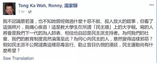 昨天下午,这所大学的民主墙上,除了有之前该校“港独”分子声援香港中文大学学生会的闹“港独”的文字、以及内地学生的反击,竟然还有恶徒在上面留言,毫无人性地为蔡女士失去儿子而欢呼,称“恭喜蔡匪若莲之子魂归西天”。