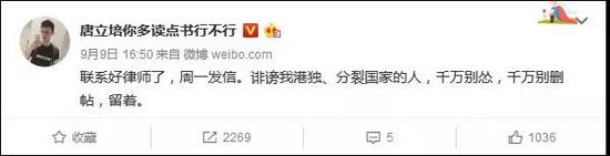 此前的9日下午,@唐立培你多读点书行不行 发布微博称,对于诽谤自己“港独”、分裂国家的言论,已联系律师。