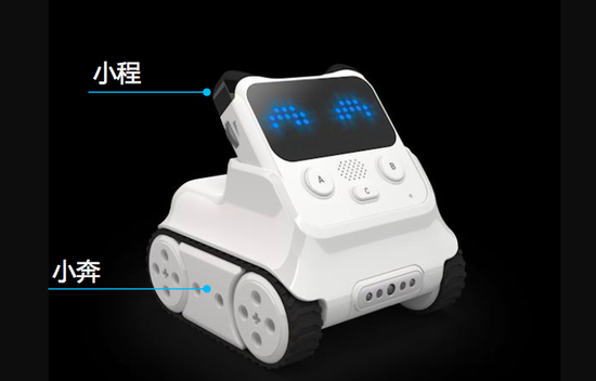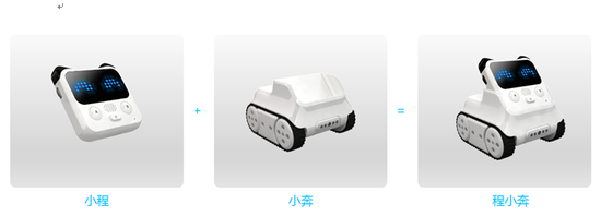 程小奔由两部分组成,是一个可分离的设计,头部可编程的控制板,叫“小程”,下面是它的座驾叫“小奔”。所有的编程逻辑(程序设计的代码)都在小程里面执行,小奔赋予小程动起来的能力,并且小程可以独立使用,小奔则需要跟小程结合才能使用。