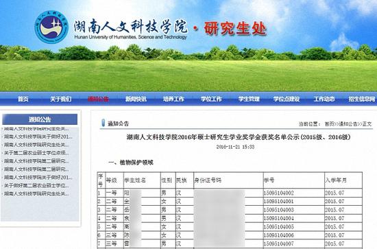 湖南人文科技学院官网2016年11月21日发布的《湖南人文科技学院2016年硕士研究生学业奖学金获奖名单公示(2015级、2016级)》部分截图。图片系澎湃新闻基于保护隐私需要打码,原页面没有打码。