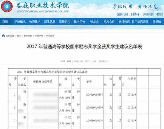 2017年11月13日,娄底职业技术学院护理学院在其官网(www.ldzy.com)发布的《2017年普通高等学校国家励志奖学金获奖学生建议名单表》。图片系澎湃新闻基于保护隐私需要打码,原页面没有打码。