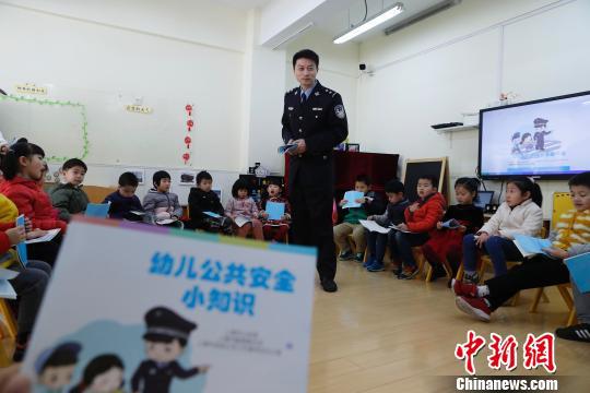 图为上海警方为幼儿园小朋友普及安全教育知识。 殷立勤 摄中新网上海2月23日电 (记者 李姝徵)“小朋友们,如果爸爸妈妈在睡觉或洗澡,这时候有人敲门,你该怎么做?”23日,上海市公安局法制总队一支队支队长沈雁辉“客串”幼师,为幼儿园的孩子们上了一堂公共安全教育课。