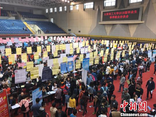 太原理工大学(分数线,专业设置)举行2018届毕业生春季就业洽谈会现场毕业生求职者人山人海。 杨静 摄