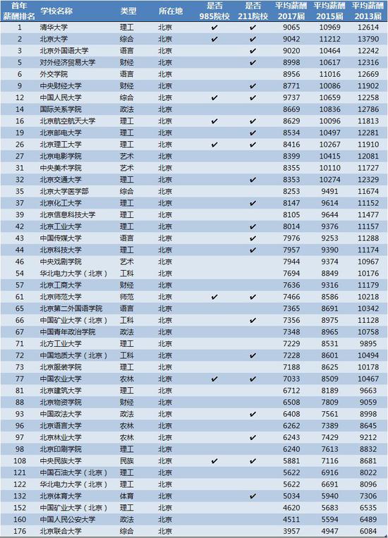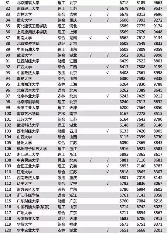 有些知名985高校如:武汉大学,湖南大学,重庆大学等排名比较靠后;但不能表明这些学校的毕业生工作不好,这样的工资水平在当地城市还是有很强竞争力的。