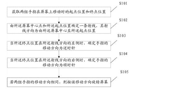 本发明提供了一种屏幕旋转方法及装置、移动设备,本发明没有采用重力传感器来对移动设备旋转方向,而是利用用户采用简单的手势在屏幕上移动,利用软件程序判断用户的手指移动方向为顺时针移动还是逆时针移动,确定移动方向后即可按移动方向旋转屏幕,整个过程无需重力传感器参与即可实现屏幕的旋转,无需用户频繁切换使用场景时和开关按键,因此本方法既提升了用户体验还保护了开关按键。