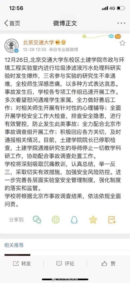 据北京交通大学(分数线,专业设置)微博通报,26日,北京交通大学东校区土建学院市政与环境工程实验室内进行垃圾渗滤液污水处理科研实验时发生爆炸,三名参与实验的研究生不幸遇难,全校师生深感悲痛,以多种方式表达哀思。目前,土建学院院长已停职检查,土建学院遇难研究生的导师停止一切教学科研工作,协助配合事故调查处置工作。学校将根据北京市事故调查结果,依法依规全面问责。