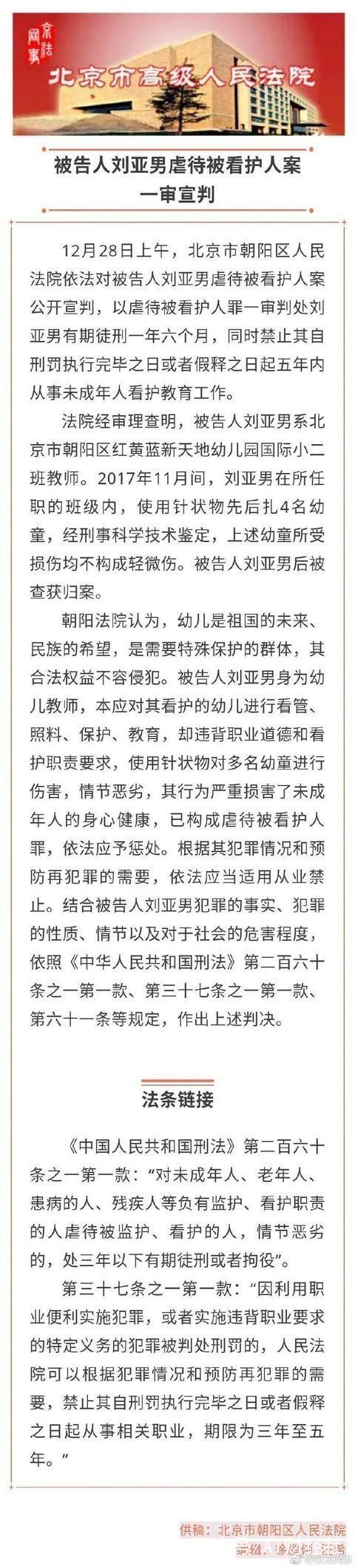 12月28日上午,北京市朝阳区人民法院依法对被告人刘亚男(北京市朝阳区红黄蓝新天地幼儿园国际小二班教师)虐待被看护人案公开宣判,以虐待被看护人罪一审判处刘亚男有期徒刑一年六个月,同时禁止其自刑罚执行完毕之日或者假释之日起五年内从事未成年人看护教育工作。