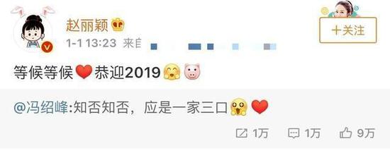 在元旦当天,冯绍峰用“知否知否,应是一家三口”的“知否体”宣布了赵丽颖怀孕的消息,而赵丽颖也回复称:“等候等候,恭迎2019”。两人的甜蜜互动让网友大喊吃了狗粮,同时也有网友戏称冯绍峰是“宣传小能手”,既公布了两人的好消息,又宣传了两人的新剧,真是一举两得。