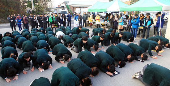 原标题:韩国今日高考 学弟学妹下跪打鼓为考生加油