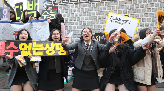 当地时间2016年11月17日,韩国2017年高考在全国各地开考。家长以及学弟学妹们在考场外为考生加油。据悉,今年参加高考的有约60万考生,通过率约60%。对于近日韩国社会的震荡和变动,有考生表示“一考完试就马上集会。”而家长们则表示希望考生们专心考试,暂时不要为外界的事情分神。