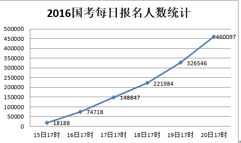 截止到10月20日17时,2016国家公务员(微博)考试报名过审人数已达460097人,与昨日17时相比增加了133551人,单日增长量呈现出近日来的小高峰。