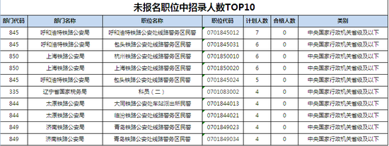 目前仍有876个职位无人报考,占总职位数的5.6%。根据华图教育(微博)数据统计,未报名职位招录人数前十名的都是铁路公安系统职位。华图教育专家分析,在所有“遭受冷遇”的职位上,原因无非有两大方面:一方面是部分职位“门槛较高”:专业要求比较狭窄、学历要求较高、工作年限要求较长、职位性质较特殊等,例如职位代码为“0701845012”的呼和浩特铁路公安局线路警务区民警一职,招录7人,要求刑事侦查专业,虽然其它条件无限制,但备注中“经常加班,有时执行夜间巡线任务,适合男性。最低服务年限五年(含试用期)。服从处内二次分配”的职位特殊要求令考生望而却步。另一方面也与工作地区有关,由于考虑到条件艰苦、个人发展等方面原因,西部偏远地区的职位报考人数普遍较少。