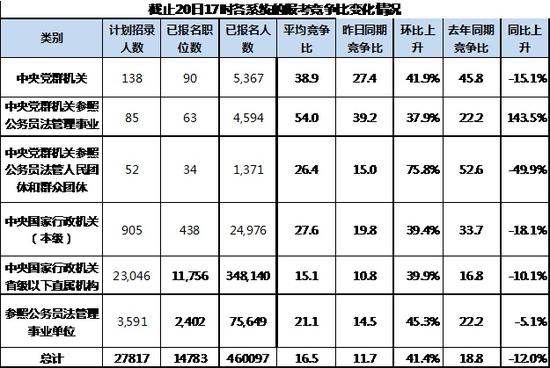 华图教育资深专家对各类别岗位的报名竞争情况进行统计,并与昨天以及去年第六日17时的数据做了对比后,得出下表: