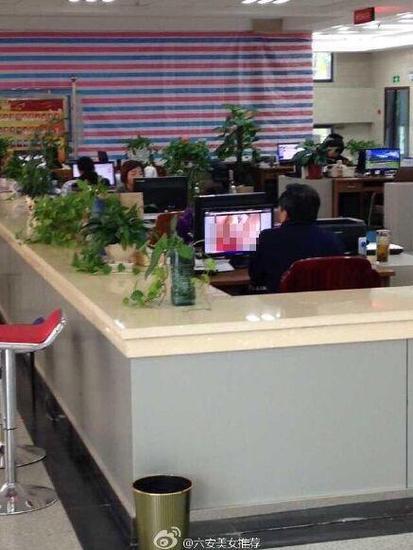 10月30日,六安本地资讯发微博称,有霍山网友反映上午10点左右去霍山县人民政府政务服务中心办事,路过旁边服务台时发现有一名工作人员在看色情视频。