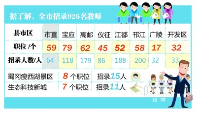 据了解,全市招录926名教师,其中:市直59个职位招录64人,宝应79个职位招录118人,高邮62个职位招录179人,仪征45个职位招录86人,江都52个职位招录188人,邗江58个职位招录200人,广陵17个职位招录32人,开发区32个职位招录33人,蜀冈瘦西湖景区8个职位招录15人,生态科技新城7个职位招录11人。