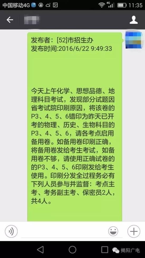 广州日报记者了解到,揭阳中考的考试时间为从6月20日知6月22日,今日上午进行化学、思想品德、地理三科科目的考试。可有考生发现,化学试卷中有三面印成物理题,“全市都错误,目前学生们都被困在教室,等候处理。”该考生称,“这是全省的试卷历史上第一次发生这么大的错误。”
