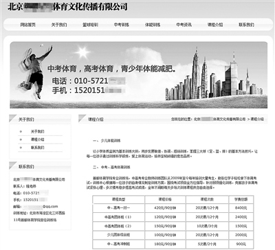 北青报记者输入“北京中考体育培训班”几个关键字进行搜索,数十个中考体育培训机构的名字随即出现在电脑屏幕上。打开这些培训机构的网页,几乎所有中考体育培训班都设置有团体班和一对一等班型。其中团体班收费大多在一节课100元左右,按期报名,每期在10次课到20次课不等。“一对一”班型的课程则更贵,每节课收费在260元到420元之间,同样是一期课程在10次课到20次课不等。据此计算,中考体育培训班最贵的收费达到8400元,最便宜也在千元左右。此外,一些中考体育培训机构还设有冲刺班或签约班,收费在千元左右不等,课时在五节课左右。