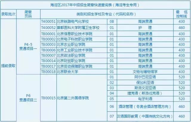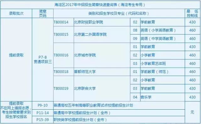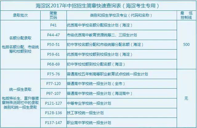 为了更好地让考生阅读招生简章,海淀区中招办制作了《海淀区2017年中招招生简章快速查询表(海淀考生专用)》,将各类招生方式进行了汇总,并注明在简章中的页码,海淀考生可根据此表,更直接、更快捷地找到相对应的内容进行查看。