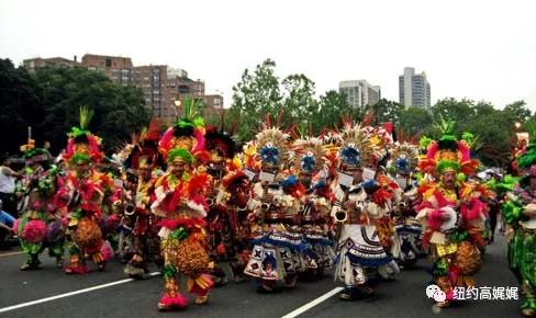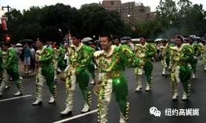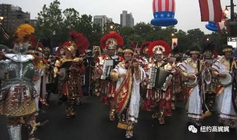 美国是一个多民族移民国家,各种民族,各种肤色,各种语言的人在这里都可以看到,在游行队伍中,就有充分的体现,看看,这只载歌载舞的队伍,穿得那么多姿多彩,是来自南美洲的民族,奔放的西班牙语系的人们,他们人还没到,吼声就来了。