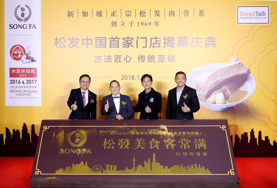 “肉骨茶文化是新加坡标志性的美食文化之一,将这种文化推广至今,并持续服务一代代的肉骨茶爱好者正是松发品牌的使命。除了新加坡本土和印度尼西亚,中国是我们最重视的市场之一。这次能够与BreadTalk Group面包物语集团合作, 将正宗的潮式肉骨茶文化推荐给中国的美食爱好者,我们感到非常荣幸。” 松发第二代传人,暨品牌常务董事杨学鹏先生表示。同时,BreadTalk Group面包物语集团首席执行官朱兴辉先生补充道:“BreadTalk Group面包物语集团于2003年在中国开设了第一家面包新语店,今年已步入第15个年头,BreadTalk Group面包物语集团也成功地在40个城市开设了面包新语,土司新语和大食代的分店。凭借BreadTalk Group面包物语集团在国内的品牌营运和管理经验,我们很有信心将松发这样一个获得新加坡米其林指南推荐的品牌成功带来中国。自松发门店1月13日试营业以来,我们就感受到了市场的积极反馈,这更坚定了我们要在中国开设更多松发店铺的信心。2018年,除了首家上海嘉里中心店以外,更多的松发门店已经在计划之中。”