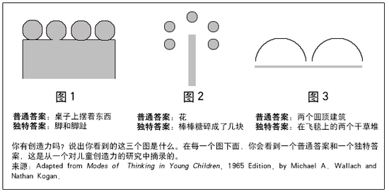 另一位心理学家,也曾是美国心理学会主席的吉尔福特(J.P.Guilford)认为,创造力是一种发散性思维,而不是聚合性思维。聚合性思维要求个体找出问题的一个最佳答案,并且要精确,这正是智力测验所测量的内容。相反,发散性思维要求个体发现问题的各种不同答案和解决办法,没有绝对正确的答案。对发散性思维的策略既可以是图形化的,也可以是言语化的。