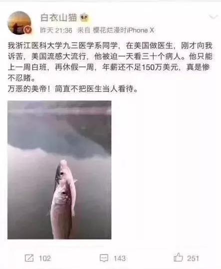 美国医生每天看30个流感病人,上一周白班,再拿着一周的休假和近12万美金的月薪,还抱怨累;中国的医生一个上午就要看50个孩子,一天下来要看上百个,拿着2500块的月薪,操着12万美金的心。