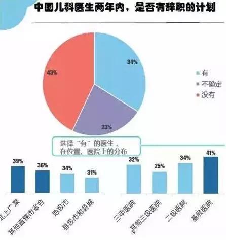 据调查,34%的儿科医生在两年内有辞职计划,23%的儿科医生不确定。基层医院儿科医生选择两年内辞职的比例更高,达到了41%。