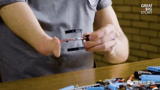 但问题是,乐高是需要两个手操作的,David没有手怎么办?他就用仅存的半截手臂配合着手去拼搭,别人搭积木是用两手的手指抓着乐高,可是他却是用一只手抓着乐高,另外用半截手臂顶着,这样才能好使劲,
