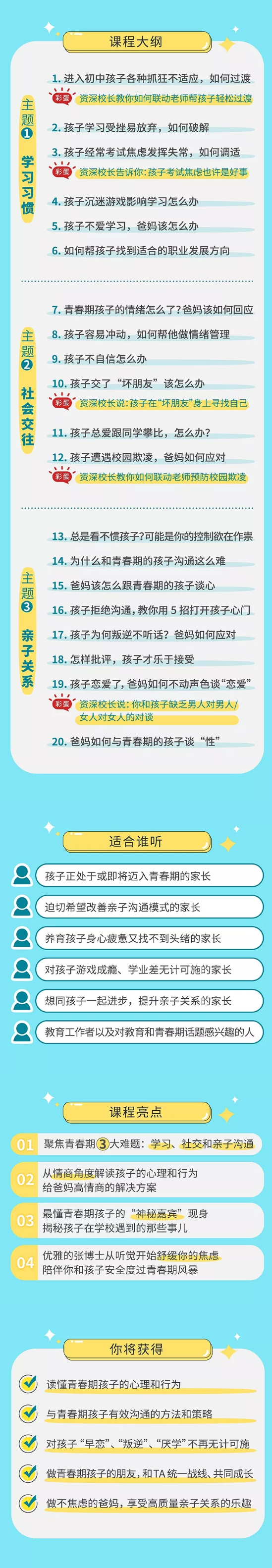 课程中还邀请了从教30多年的上海市中远实验学校的陈校长结合教学经验所带来的真实案例分享,和张怡筠博士一起,共同为您的青春期的孩子护航!