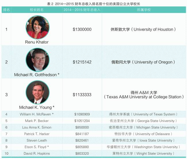 排名首位的是雷努•卡托尔,2008年起她就任休斯敦大学校长,2014—2015财年她获得了130万美元的薪酬。其中包括70万美元的基本工资、20万美元奖金和40万美元的递延报酬。卡托尔校长与百事可乐公司总裁兼首席执行官英德拉•努伊一同被看作美国印度裔女性移民的杰出代表。