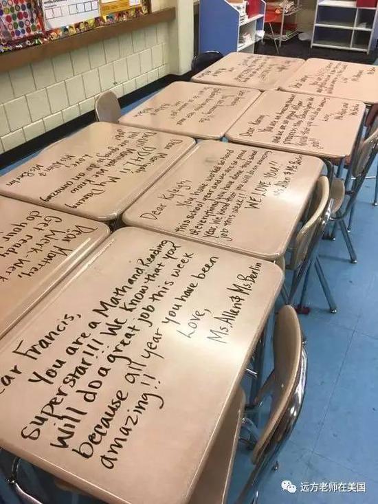 (兰福德老师和她的学生们)兰福德老师做的这一切让学生们兴奋和感动,由考试带来的紧张也随之消散。很多学生甚至说舍不得擦掉老师专门写给自己的暖心而励志的话,想把这些话永远留在课桌上。