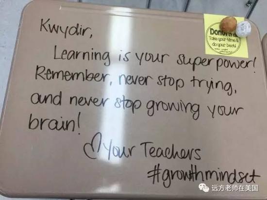 每个课桌上最下面的一行字都是“成长心态(growth mindset)”,这是兰福德老师从学期之初就在班级里开展的一个项目。
