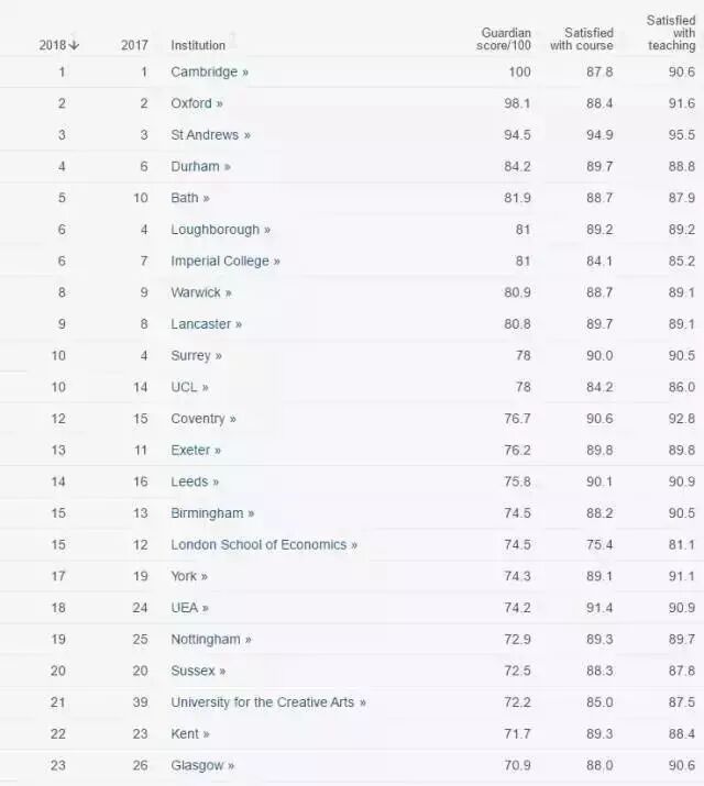 排 名中牛津大学和剑桥大学依旧引领英国各大高校,妥妥的位于榜首之位;圣安德鲁斯大学紧随其后,名列第三;拉夫堡大学从2017年的第四名滑落至第六名;杜 伦大学从去年的六名上升到2018年的四名;巴斯大学表现最为突出,从2017年卫报排名的第10名,一跃到第5名,名副其实的黑马,其他英国大学排名变 化如下