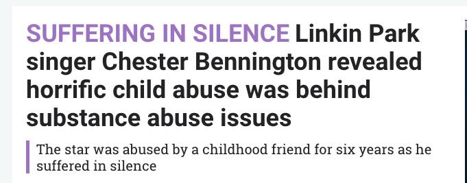 7月20日,美国传奇摇滚天团“林肯公园”主唱、一代巨星查斯特·贝宁顿被证实自杀,他的生命定格在41岁。