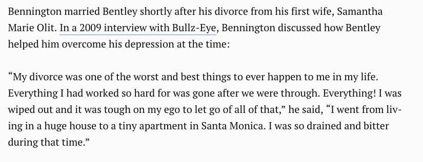 外界眼中,摇滚歌手和叛逆、放荡的生活方式几乎是毫不违和的“固定搭配”。查斯特酗酒成瘾、吸食大麻的岁月只被当做供人消遣的八卦和谈资,没有在娱乐至死世界溅起太大的水花。