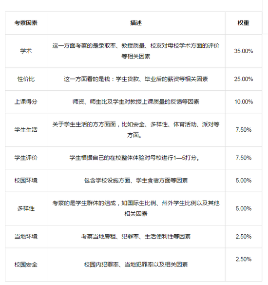 以上不同的等级代表该校在这一项参考维度上学生和家长给出的综合评分,从上图汇中展示可见,Niche给出的评选因素所涵盖的范围非常广泛,无论是学术还是住宿及饮食,无论是天气交通还是院校安全,全都覆盖。注:因多数美国大学或多或少存在着吸食毒品的不良少年,基本所有学校在drug safety这一项上分数都较低,请家长比较不同学校的等级来评价,不要因为看到C或C-就认定学校中毒品泛滥)。