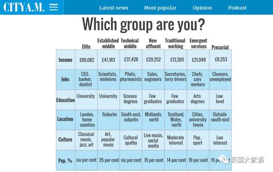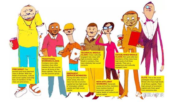 伦敦政治经济学院教授麦克·萨瓦格(Mike Savage)将英国社会分为7层。除上述两种,依次还有技术性中产阶级(Technicalmiddle class)、新型富有工作者(Newaffluent workers)、传统型劳动阶级(Traditionalworking class)、新型服务工作者(Emergentservice workers)、不稳定无产者(Precariat),划分标准如下: