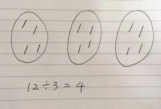 比如:12除以3,老师会让孩子先画 3个圈,然后依次往这3 个圈里划道,并数数到12,最后再查一查每个圈里有几道,就是得数。