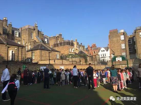 每天早上8:45到校,孩子会在操场上集合,然后由班级老师统一领队进入教室。