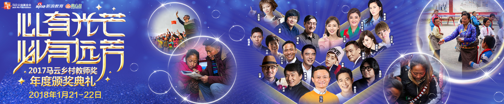 1月21日,海南三亚,2017马云乡村教师奖颁奖典礼在香格里拉大酒店举行,典礼再次为100名乡村教师颁奖。典礼来了众多娱乐圈明星助阵,包括成龙、李连杰、梁家辉、孙俪、汪涵、高晓松、宋小宝……而真正的明星则是那100位乡村教师。马云与到场明星和社会各界一起助力乡村教育,改变中国乡村。[详情]