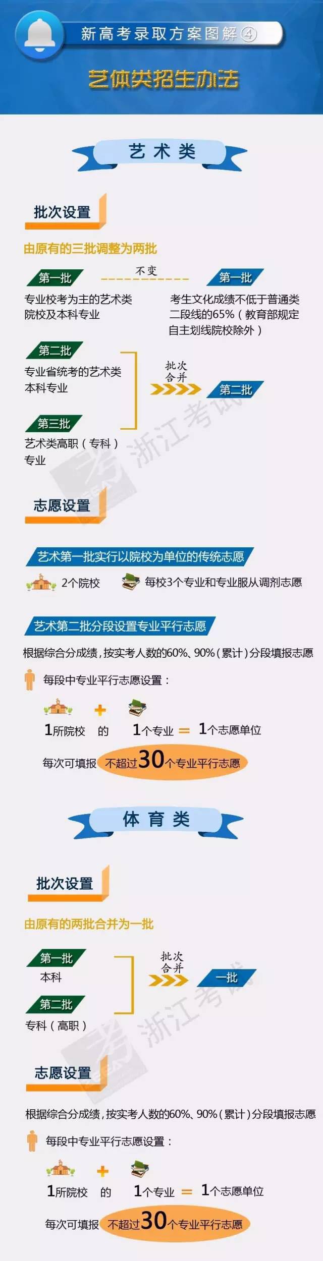 新浪教育讯 作为全国高考改革试点省份,浙江日前公布了2017年普通高校招生录取工作方案。按照改革方案的要求,录取不分批次,实行专业平行投档,填报志愿与投档按考生成绩分段进行。录取分普通类、艺术类、体育类,其中普通类分提前录取和平行录取。 以下是方案原文。 2017浙江新高考录取热点问题答疑 有哪些新变化 浙江省2017年普通高校招生录取工作方案 根据浙江省人民政府印发的《浙江省深化高校考试招生制度综合改革试点方案》(浙政发〔2014〕37号)和教育部有关定,特制定本方案。 2017年普通高校招生录取分普通类、艺术类、体育类三类进行。 一、普通类专业招生录取办法 普通类专业分提前录取和平行录取。提前录取实行传统志愿,平行录取实行专业平行志愿。 (一)平行录取办法。 根据实考人数的一定比例,按照考生高考总分(含政策加分,下同),分段填报志愿、分段录取。 1.分段办法。分三段,分别按实考人数的20%、60%、90%确定。 2.志愿设置。实行专业平行志愿。一所学校的一个专业(类)作为一个志愿单位。考生每次可填报不超过80个志愿。 3.录取流程。第一段考生先填报志愿,随即投档录取;剩余计划重新公布,未被录取的第一段考生和第二段考生填报志愿,再组织投档录取。以此类推。第三段志愿填报和录取后, 如仍有院校专业(类)未完成计划的,经学校申请,可适当扩大比例征求志愿。 4.投档办法。以考生符合所填报志愿的选考科目范围为前提,根据考生高考总分,实行专业平行志愿投档,直接投到考生所填报的具体学校的具体专业(类)。投档比例为1:1,高考总分相同的考生,依据位次、志愿顺序投档。 5.考生位次。根据所有考生高考总分确定。考生高考总分相同时,按文化总分、语文数学总分、语文或数学单科成绩、 外语单科成绩、选考科目单科成绩高低排序,全部相同者为同位次。 (二)提前录取办法。 军事、公安、定向招生、三位一体招生等有政审、面试等特殊要求的学校、专业(类)继续实行提前录取。提前录取专业不再分批,实行分段录取。 1.志愿设置。继续实行以院校为单位的传统志愿。考生可填报不超过5个院校志愿,每个院校志愿可填报不超过6个专业志愿和专业服从志愿。专业志愿和专业服从志愿调剂均须符合高考选考科目要求。不再设院校服从志愿。 2.录取。本、专科不再分批。根据普通类专业的分段原则,分段提供政审面试名单、分段投档录取。每一段录取时,根据志愿优先原则,按高考总分从高分到低分顺序投档录取。 省内地方属高校三位一体综合评价招生同时进行。北京大学、清华大学等高水平大学的三位一体综合评价招生继续在高考填报志愿前完成录取。 高校自主选拔、高校专项计划、高水平艺术团、地方专项计划在提前录取的最后一天进行,其最低文化要求原则上不得低于我省第一段分数线。 二、艺术、体育类专业招生录取办法 (一)专业科考试及综合分合成办法按现行办法执行。 (二)艺术类专业分两批。 艺术第一批(以专业校考为主)继续实行传统志愿。设院校志愿2个,每个院校志愿设3个专业志愿和专业服从志愿。录取办法与现行办法相同。除报考教育部规定可自主划线的院校外,其他考生文化成绩(高考总分)须不低于我省普通类第二段线的65%。 实行专业省统考的原第二批和第三批合并为第二批,实行专业平行志愿。考生每次可填报不超过30个志愿。按照考生综合分成绩分为两段,分别按各类别实考人数的60%、90%确定,分段填报志愿,分段录取。考生位次按综合分成绩分类别确定,综合分成绩相同时,按专业科成绩、普通类专业文化成绩排序确定。 (三)体育类合并为一批录取,实行专业平行志愿。具体办法与艺术类第二批相同。 三、平稳实施保障措施 (一)加强组织领导。 各级党委、政府要把高考综合改革试点作为选拔和培养创新人才、促进区域经济发展的大事来抓,作为关系千家万户切身利益的民生工程来抓,强化属地管理、属地负责意识,协调解决改革推进过程中出现的困难和问题,严肃查处违规行为。 完善人财物及制度配套,深入推进教学改革,提升教育质量。 建立协调机制,强化正面舆论导向,为改革营造良好氛围。 (二)确保公平公正。 根据教育部有关规定进一步完善具体实施办法,确保规则明确、程序公正。深入实施阳光招生工程,进一步完善信息公开机制,确保信息公开透明。加强依法治招,严肃招生工作纪律。 (三)优化服务指导。 开展全覆盖培训,组织模拟演练,确保考生、家长、中学、高校正确理解政策,尽快适应新录取办法。研发志愿填报等信息平台,为考生提供相应的参考资料和便捷查询服务。 附件:浙江省2017年普通高校招生普通类平行录取志愿表样张 责任编辑:戴全英[详情]
