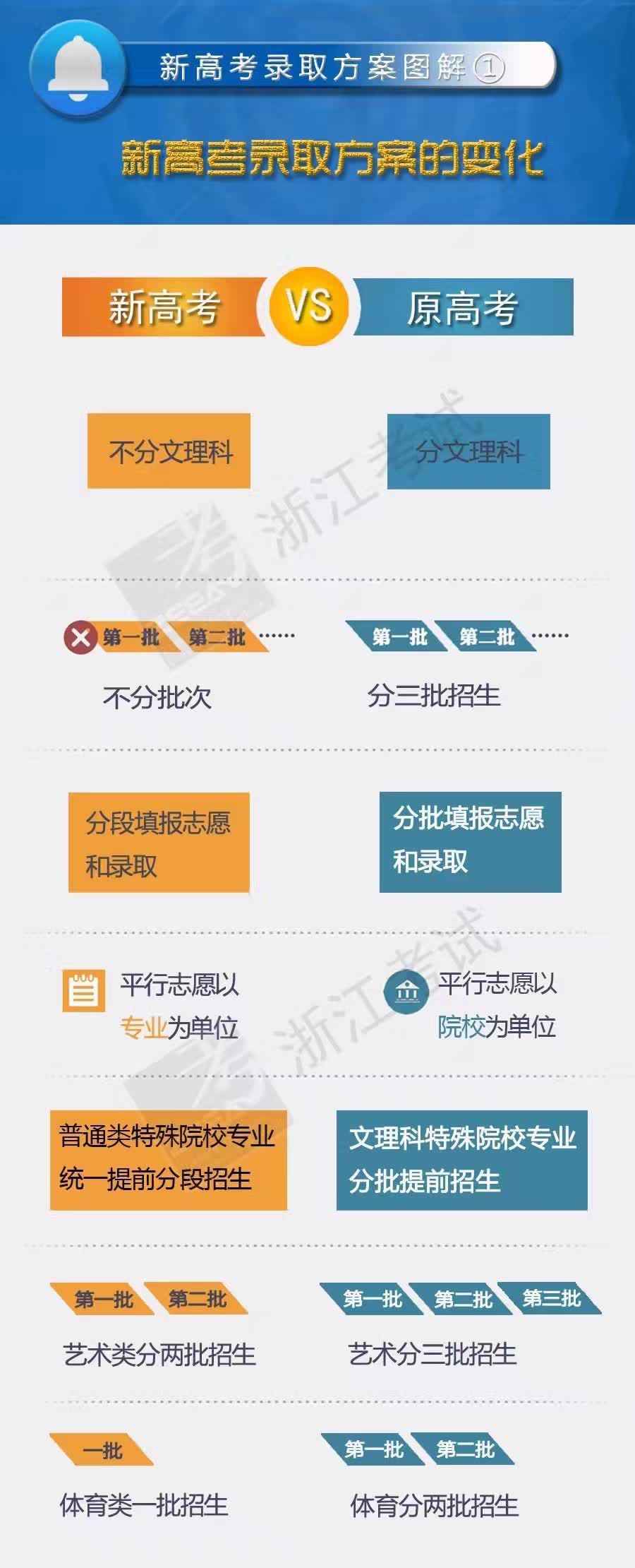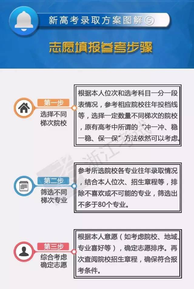 1月6日,牵动数十万浙江考生和家长的浙江省2017年普通高校招生录取工作方案正式公布。 不分文理科、每个考生可填80个志愿、志愿按专业填、录取也不再分批次……新出炉的方案与以往相比有了许多的不同之处。 作为改革后的第一届考生和家长,心中难免会有疑惑和焦虑,那么今天,小编就带大家一起来听听一线教师和专家怎么说,也许你会找到想要的答案! 新录取方案,化繁为简稳中有变 浙江省杭州高级中学校长、特级教师 尚可 浙江作为全国深化高考招生制度改革的试点,课程结构教学形式和高考方法变化很大,许多人想象其招生录取方案会很复杂。但事实上在我看来,刚出台的方案是化繁为简、变中求稳的。 新方案仍然分普通类、艺术类、体育类三类,普通类改原来的分批为不分批,改按批次分批填报志愿和录取为按成绩分段填报志愿和录取,改学校平行志愿为专业平行志愿。这些变化是自然合理的,特别是段的划分比例和原来的批次上线考生比例稳中有升,因此考生的成绩名(位)次的功能作用和原方案相比基本不变,这种稳定的保持给考生和高校都吃了一个定心丸。此外,改分批设提前批为只设一个提前批,志愿设置和老方案基本保持不变。艺术类改三批为两批录取,体育类改两批为一批录取。这些改变反而是化繁为简了!当然,因为是新的且有变化也会使一些同学和家长感觉复杂,相信随着了解和熟悉,特别是通过省统一安排的模拟演练后,这种感觉会逐步消除。之所以取消录取批次,是为了打破人为给高校及专业分等定位并贴上标签的嫌疑,也有利于激发高校的办学积极性,所以这也是国务院考试招生改革意见中的明确导向。 实行总分分段填报录取,可以在实施之初填报志愿有所参照,投档和录取能较有序地分段进行,特别是减少高分考生因志愿填报不当而录取学校落差太大。同时,也避免高水平大学不同专业的分差过大。分段填报录取虽较分批次方法有所变化,但其变化有迹可寻,体现的是合适的过渡和衔接。一、二段分段比例与原先的一、二批比例略有增加。因此各段上线人数比老方案的各批次上线人数会稳中有升,这就使首次实行新方案的考生的定位有了一个熟悉的参照系,使学生仍然可以依所在的段及位次大致定位,从而减少无谓工作量,减少偏差,并使志愿选取和填报更具针对性,选已所好、择已所愿! 新录取方案,亮点真不少 浙江大学宁波理工学院副院长、教授 梅乐和 经过一个时期的调研、制定、征求意见、修订、论证及报批,适应浙江高考制度综合改革政策的2017年招生录取工作方案正式公布。作为高校分管招生录取工作者,觉得这个工作方案亮点不少。 化繁为简。方案体现了与原来老高考录取办法的有效衔接,简化了原录取方案的繁琐过程,特别是优化每批次的补填志愿、再录取,可以大大减少高校的录取工作量,缩短录取工作时间,也可缩短整个招生录取工作的时间,更好地与高校的教学工作有效衔接,克服了过去招生时间长,最后一批录取时间晚,致使部分高校开学晚、有效教学时间不得不缩短的问题。同时,工作方案也使每段的录取时间缩短,对消除考生及家长等待录取消息的时间长而引起的焦虑感有很好的帮助作用,减少了不必要的消耗。 增加选择。无论是选考科目还是专业志愿填报,改革都充分体现了考生的自主选择权。方案中将考生可以填报的专业数定为80个,是在征求各方意见后的合理选择。看上去“专业+学校”不好填,事实上考生没必要为此烦恼。从选择指向看,通常一部分考生是以专业为优先,一部分是以学校为优先,新方案很好地满足了考生的这两方面要求,特别是满足了专业优先考生的要求。今后,只要合理填报志愿,不会产生进入考生并不喜欢专业学习的情况。平行到专业的志愿填报方法,实际上考生仍可以参考原有"冲一冲,稳一稳,保一保"的方式选择志愿,这既能让考生选到自己喜欢的专业,也能最大程度规避考生风险。 稳中有变。改革方案有很多创新举措,考虑到新老高考方案的衔接,始终贯穿平稳过渡的思想。如按照类似原有批次划定的方式将考生分为三段填报志愿,既避免高分考生志愿填报失误而造成巨大落差,又可以使院校招到合适的生源。分段的设计与原办法的批次有一定的衔接,新高考分段比例主要参考原相应批次上线考生比例,且上线人数略微增加。这一设计,不仅让改革初期投档保持有序,也使考生填报志愿有一定的参考依据。新方案一段比例设置较为合理,不仅保证了高水平高校的生源和录取需要,也使拥有强专业的高校有了获得好生源的机会。 形成倒逼。从高校角度看,新方案体现了改革精神。按照“专业+学校”模式进行投档,将充分激发高校专业的办学自主权,倒逼高校练好“内功”、加强专业内涵建设,可以有效解决当前存在的重专业设置、轻专业建设的问题。在新的录取模式下,一般高校的“名专业”,会出现“门庭若市”的景象;即便是“名校”,办得不够好的专业也会出现招不足甚至招不到学生的问题。高校越是重视专业建设,越是注重优化专业结构,越是加强培育特色专业,学生终究是最大的受益者。 若当年是新高考录取模式 我将走上另一段完全不同的人生 杭州市长河高级中学高级教师 杨春林 浙江新高考录取方案发布之后,引起了全社会的普遍关注。理解支持居多,吐槽不满