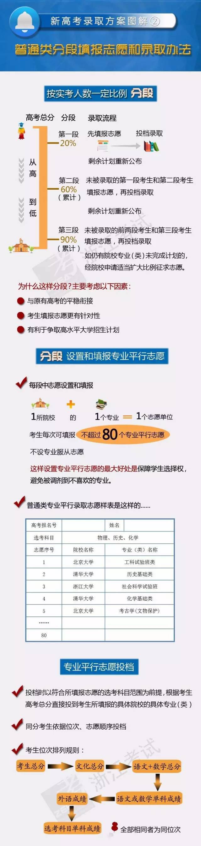 作为高考综合改革在录取环节的进一步细化,浙江省新高考招生录取方案出台啦!从2017年起,普通高校招生不分批次,实行分段填报志愿、专业平行投档录取。那么,新的招生录取方案依据哪些原则制定,具体是怎样的?一起来聚焦。 方案制定原则 公平公正,确保规则公平、简明、刚性;以生为本,以学生需求为导向,扩大考生选择权,维护考生利益; 平稳过渡,尽可能保持与原有办法的衔接。 方案形成过程 新高考录取方案的制定历时两年多,在系统内反复调研、反复征求意见、反复分析的基础上形成。 聚焦1 新高考录取方案有啥变化 2017年浙江省新高考录取分普通类、艺术类、体育类。一图了解新高考录取方案的变化 聚焦2 普通类分段填报志愿和录取是怎么回事 根据考生成绩,按实考人数的一定比例分三段填报志愿和录取,每段均按1:1比例投档。改以院校为单位的平行志愿为以专业为单位的平行志愿,考生每次可填报志愿数不超过80个。 聚焦3 提前招生录取怎样进行 普通类中有特殊招生要求的院校实行提前录取(含军事、公安、定向招生及三位一体招生等)。新高考改分批提前录取为不再分批,统一在普通类平行录取前分段录取。 新高考形成以统一高考招生为主体,分类考试、多元选拔录取模式并存的新格局。 三位一体综合评价招生,除北大、清华等高水平大学在高考志愿填报前完成录取外,其他院校安排在普通类提前录取;高职提前招生实行“一档多投”;单独考试招生全面实行“文化+技能”考试招生,按照专业平行志愿投档录取。 此外,高水平大学自主选拔、高校专项计划、高水平艺术团、地方专项计划,统一在提前录取的最后一天进行,其最低文化要求不低于省第一段分数线。 [详情]