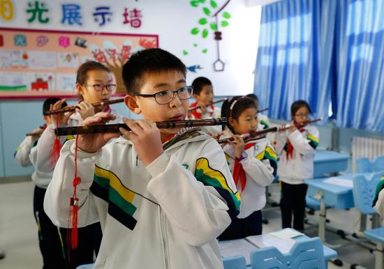 器乐类课程有12门,古筝、杨琴、琵琶、唢呐、长笛、二胡等,小乐团也已成立,本学期我们还组建了行进打击乐团。普及性的乐器是陶笛和口风琴。学校还有合唱团、曲艺班(快板、单弦)等。我们希望每一个孩子都能受到美的熏陶,还要为有兴趣的孩子提供更好的发展空间。