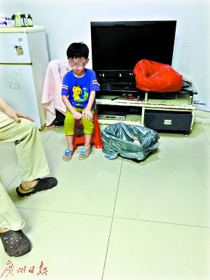 相比起母亲讲话时的情绪激动,儿子在众人面前则特别安静,他戴着厚厚的眼镜,端坐在小板凳上,局促地玩着自己的手指,时不时撩一撩裤腿。