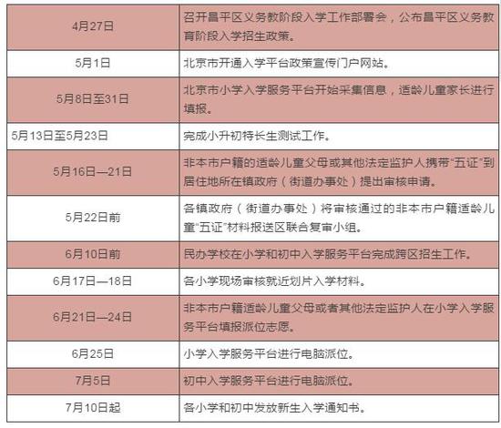 2。非本市户籍的适龄儿童少年,因父母或者其他法定监护人在平谷区工作或居住,需要在平谷区接受义务教育的,应按规定时间登录“北京市义务教育阶段入学服务平台”完成基本信息登记,并由其父母或其他法定监护人持本人在京务工就业证明、在京实际住所居住证明、全家户口簿、北京市居住证(或有效期内居住登记卡或暂住证)、户籍所在地街道办事处或乡镇人民政府出具的在当地没有监护条件的证明等相关材料(以下简称“五证”)于5月17日-31日(法定公休日除外)到居住地辖区内街道办事处或乡镇人民政府的社区教育办公室进行初审。初审合格的,由居住地街道办事处或乡镇人民政府按规定时间将申请人“五证”原件及复印件等材料报送至区联合审核现场。联审合格后,家长自行打印信息采集表,并到区教委确定的学校联系就读。