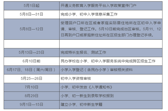 5月8—12日完成申请、审核、登记工作。家长持户口簿、房屋产权证等相关材料到学籍所在小学进行初审。符合条件的,学校在初中入学系统上提交转出申请,然后打印申请表,家长持申请表、户口簿、房屋产权证等相关材料到教育考试中心办理审批手续。5月10日前完成出区审核,5月11、12日再到户口或家庭新住址所在区招生部门办理登记手续,原学籍所在区不再拥有其初中入学资格,逾期不予办理。