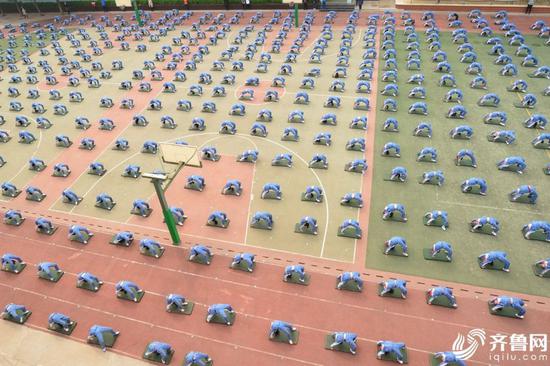 图为学生们在做课间操。横叉、前滚翻、仰卧推起成桥、肩肘倒立……老师们将其用音乐串联,再附加上一些辅助动作,就是他们课间操的内容。即使在外人看来难度颇高,但孩子们整齐划一 的动作和柔软矫健的身姿让记者感受到他们努力练习过的痕迹。