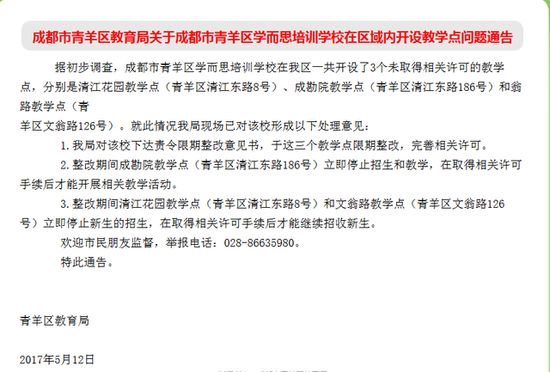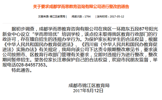 张志红透露,还没有接到有关学而思违规办学的其他举报,“学而思在准备齐办学所需材料,完成在成华区的办学资质办理后,就能够继续招收新生。”