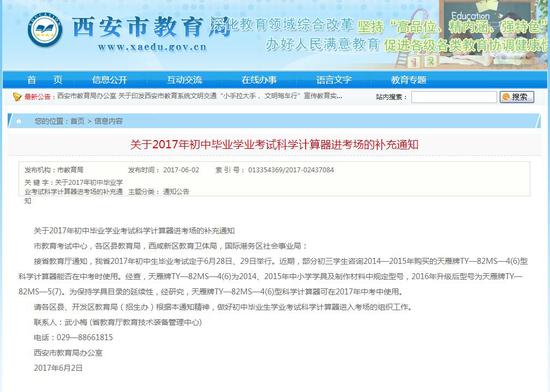 今天上午,西安市教育局在其官网发布通知,对该事件做了最新回复,称天雁牌TY—82MS—4(6)型科学计算器(就是学生之前使用的旧款)可在2017年中考中使用。